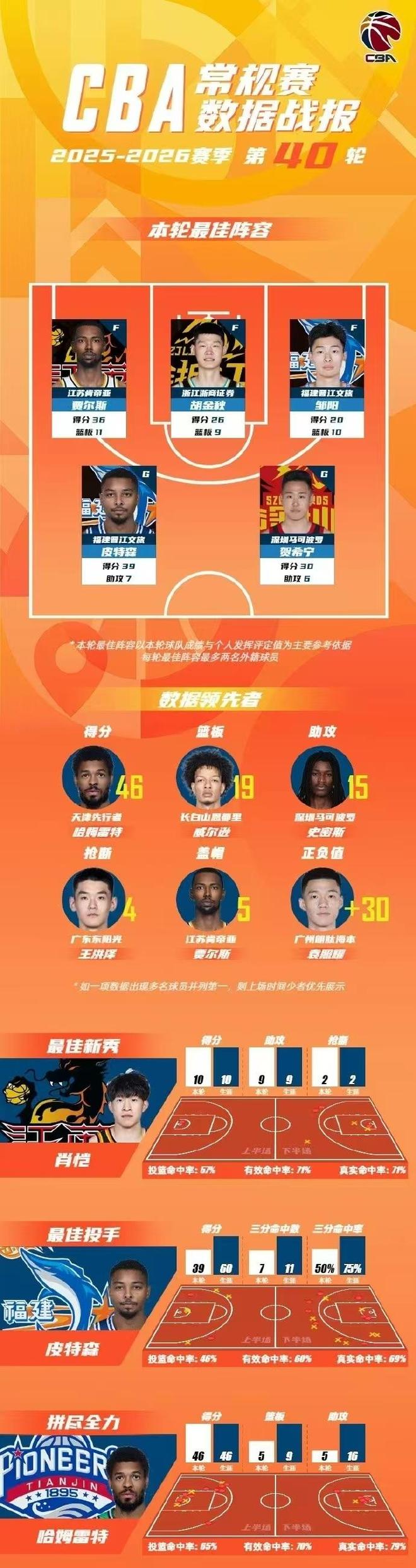 北京时间4月19日,CBA官方公布常规赛第40轮最佳阵容,贺希宁30+6率领深圳15连胜创队史纪录,胡金秋26+9率领广厦完成18分逆转,福建双星邹阳与皮特森率队完成19分逆转队史首次客场战胜广东,也是时隔15年战胜广东,贾尔斯36+11率领江苏爆冷险胜山西。