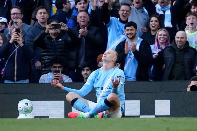哈兰德打入反超比分的进球后做出标志性庆祝动作